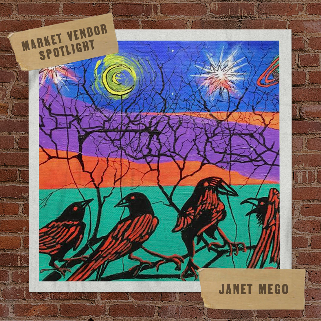 Janet’s themes have evolved and become more focused in the past few months: “Most recently, as I continue to recover from my mastectomy, and my father’s death one month prior to my cancer diagnosis, I’ve begun this latest series of paintings, this time time hoping to combine some poetry with visual elements. In addition to crows, other symbols, among them specific types of flowers and dancers, have taken shape in my work, almost of their own accord, it seems. The fantasy crows, weaving and bringing flowers, demonstrate their own creativity and joie de vivre, reflect my own renewed lease on and love for life.