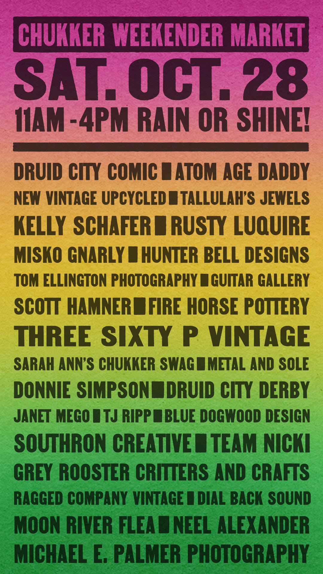 Before the Weekender music starts up (again) a market of Chukker-related Art & Collectibles will be open—Saturday, 11:00 a.m. to 4:00 p.m. at Druid City Brewing Company (DCBC; 700 14th St, Tuscaloosa, AL 35401; 205-342-0051). Come get you some.